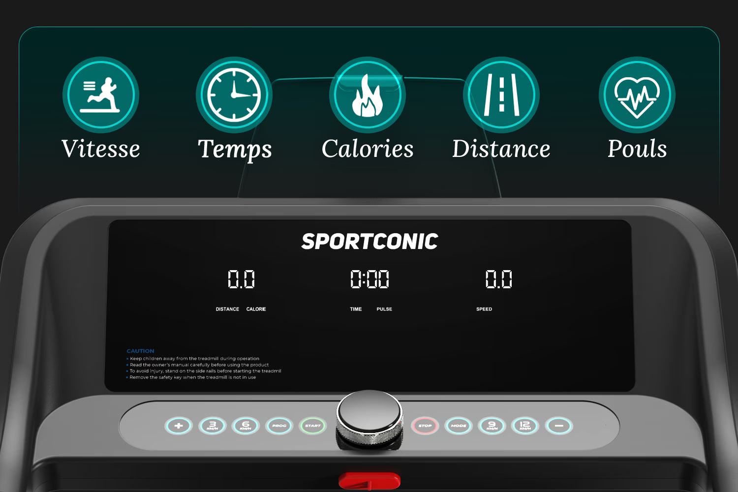 Le tapis est équipé d’un écran LED lumineux qui affiche en temps réel la distance, le temps, la vitesse, la fréquence cardiaque et les calories brûlées.