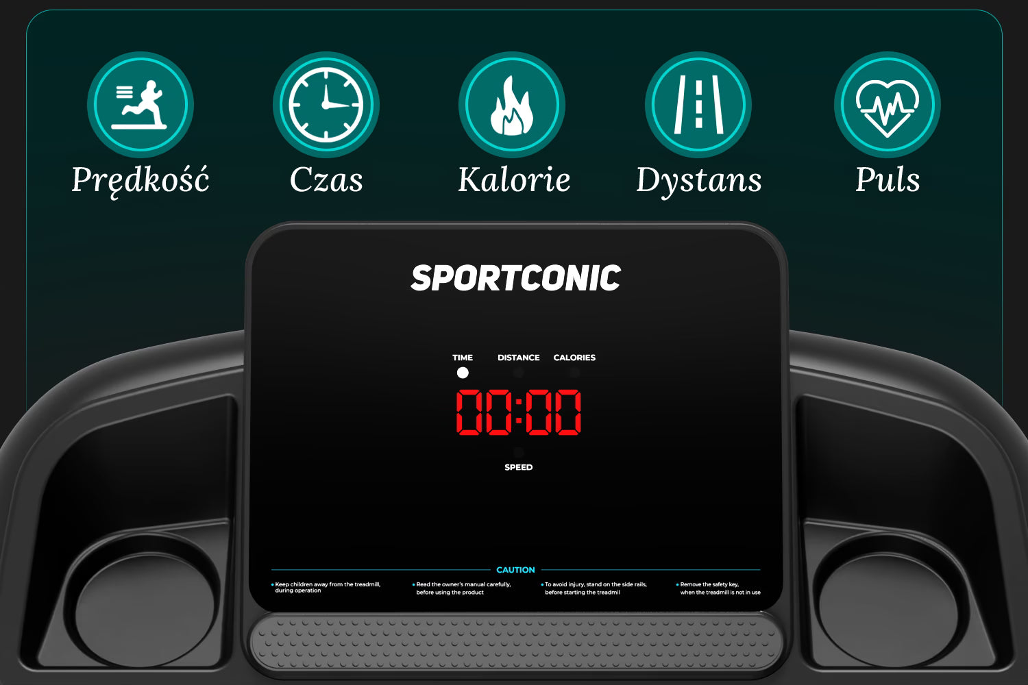 Bieżnia ma jasny wyświetlacz LED, który pokazuje w czasie rzeczywistym pokonany dystans, czas, prędkość, tętno i spalone kalorie.