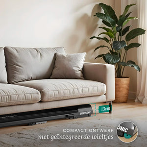 Thanks to its smart, compact design it’s perfect for home use. At just 13 cm folded height, it slips under a sofa, bed, or cabinet, and the built-in wheels make repositioning effortless—even in tight rooms.